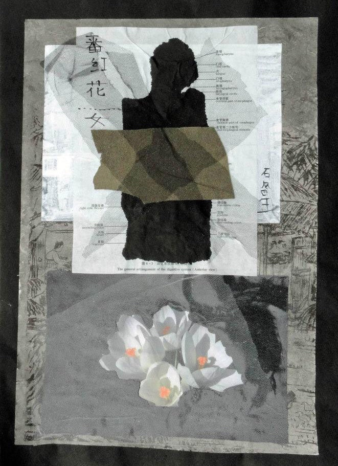Inchiostro cinese, inchiostro coreano, penna a inchiostro, pittura domestica, acrilico, candeggina al cloro, carta di riso stampata, Hanji stampato, foto trovata, rete e feltro su Hanji